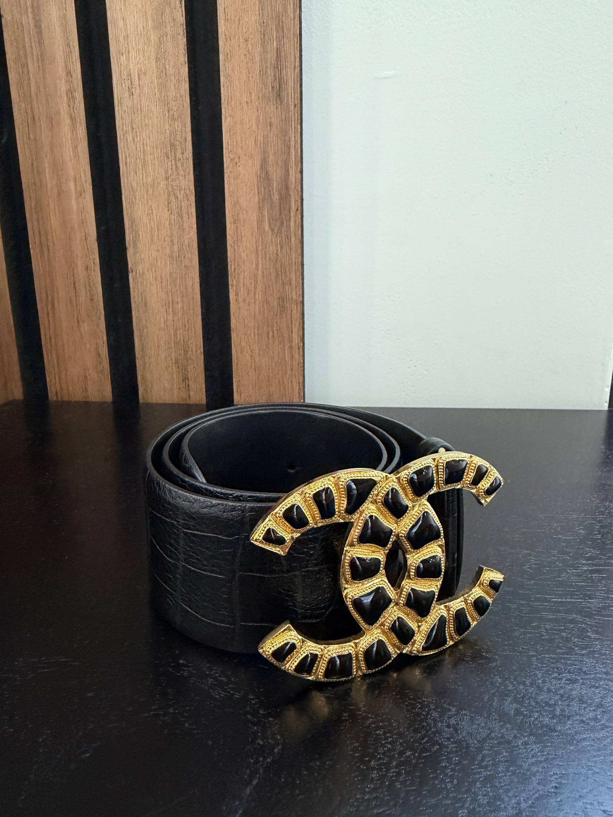 Chanel Patent Crocodile Affect Belt With Gold Hardware