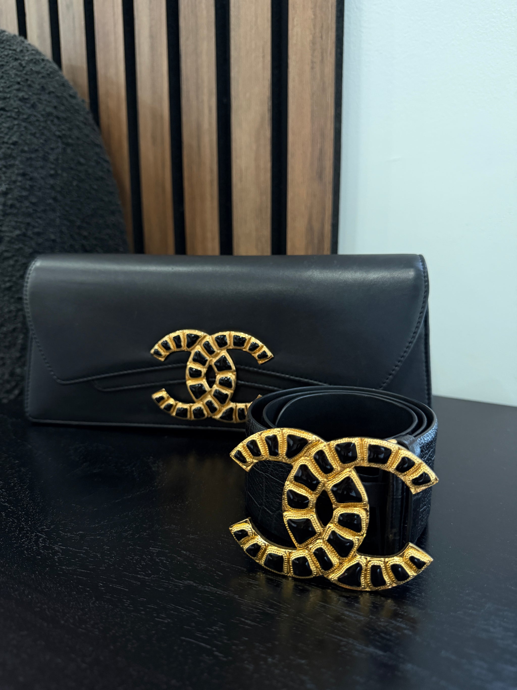 Gently used. Tailored to a XXS-XS. Chanel crocodile affect patent leather belt with gold hardware. Tailored to a 23” to 25” waist. Matching clutch available as well.
