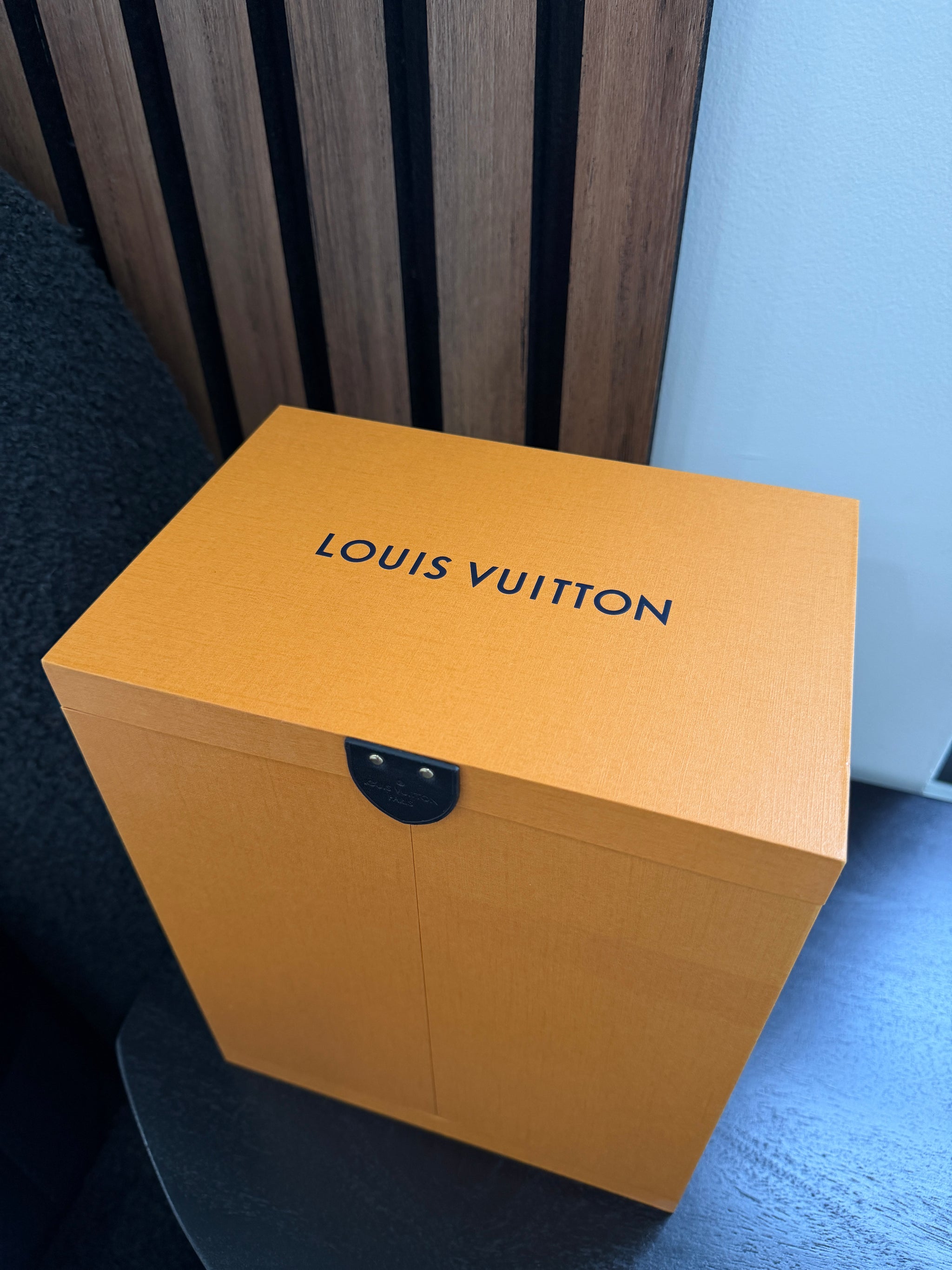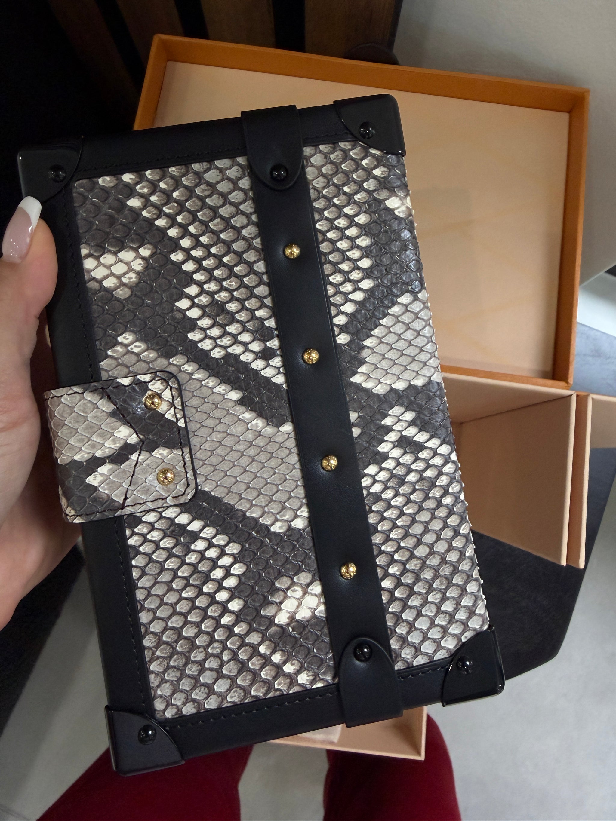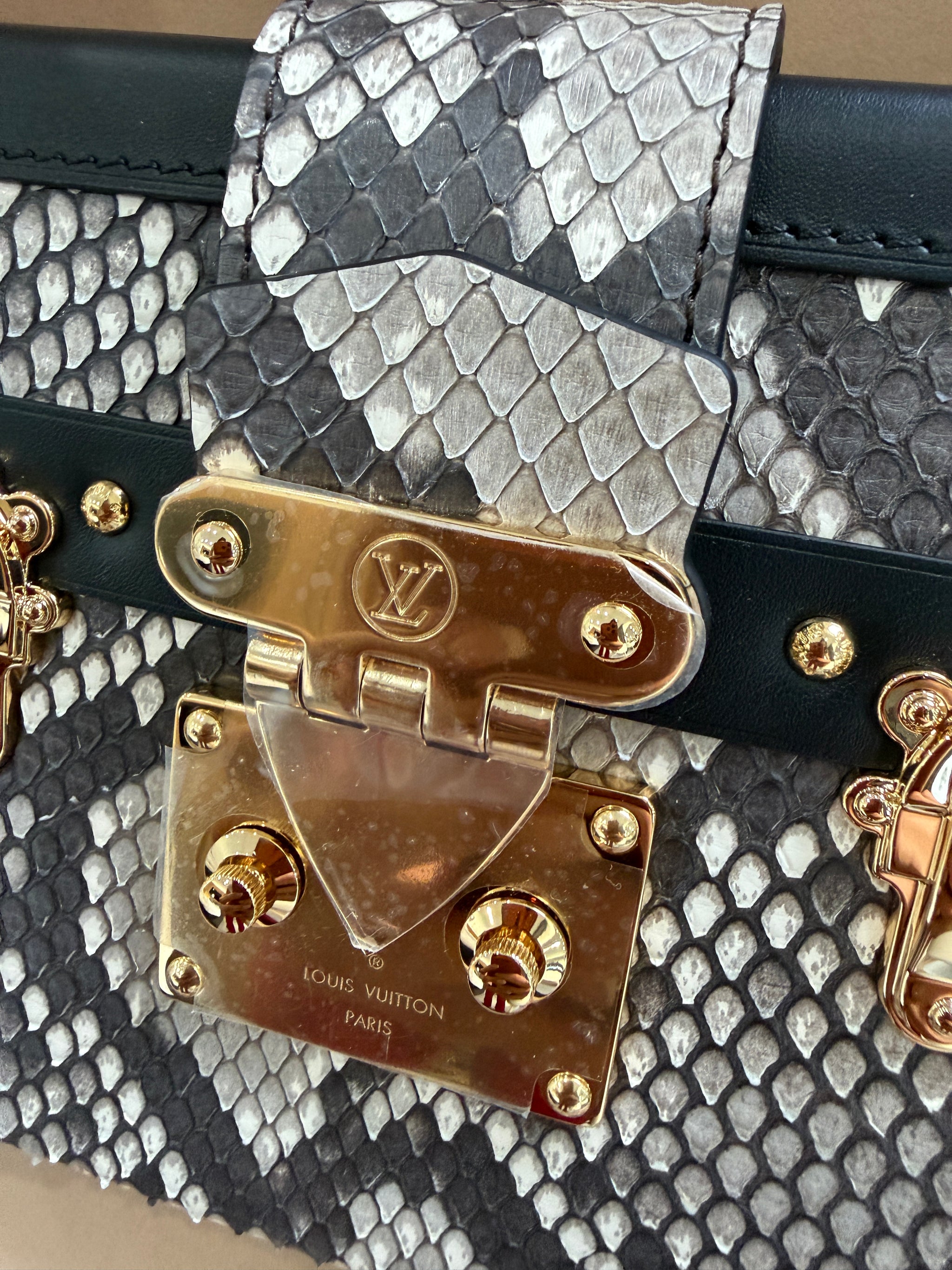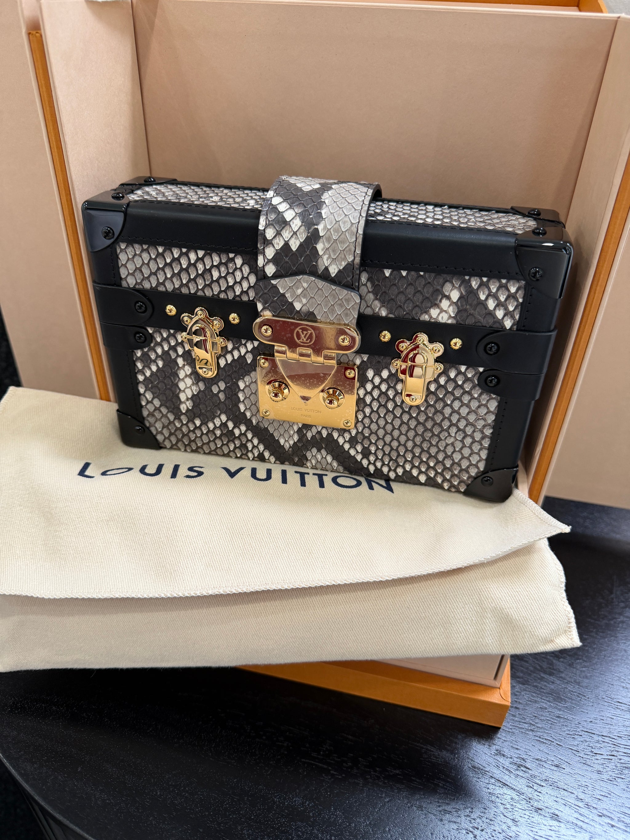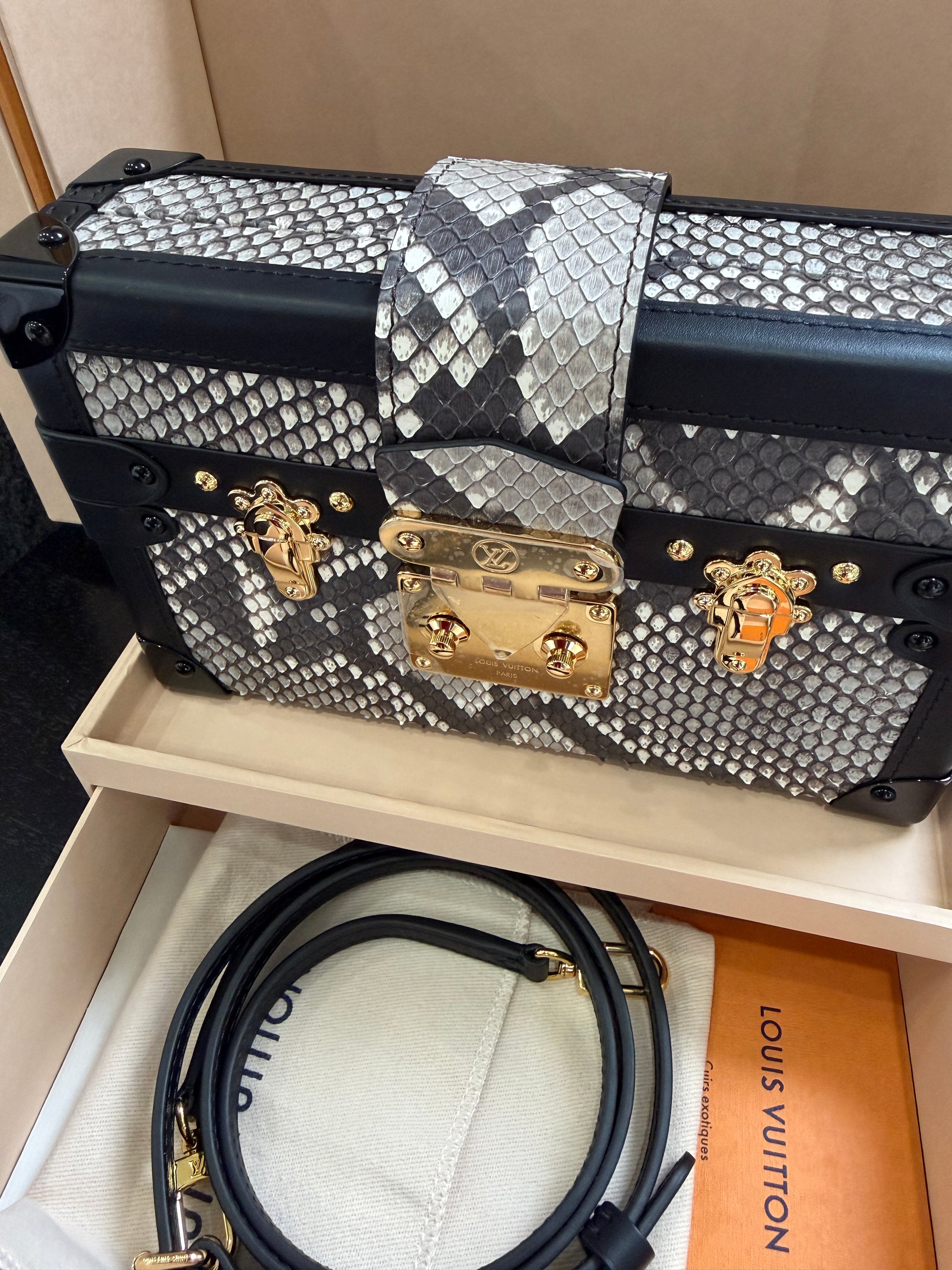 Rare Louis Vuitton Petite Malle handbag made with python skin and leather. It features gold locks and a black handle/strap. Only 12 made.
